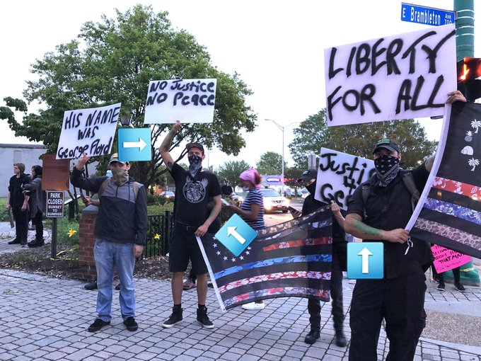 There are some damn weird white people spotted in Minneapolis. These guys are holding a Boogalo flag. The arrows are pointing to green paint that they’ve used to obscure tattoos.
