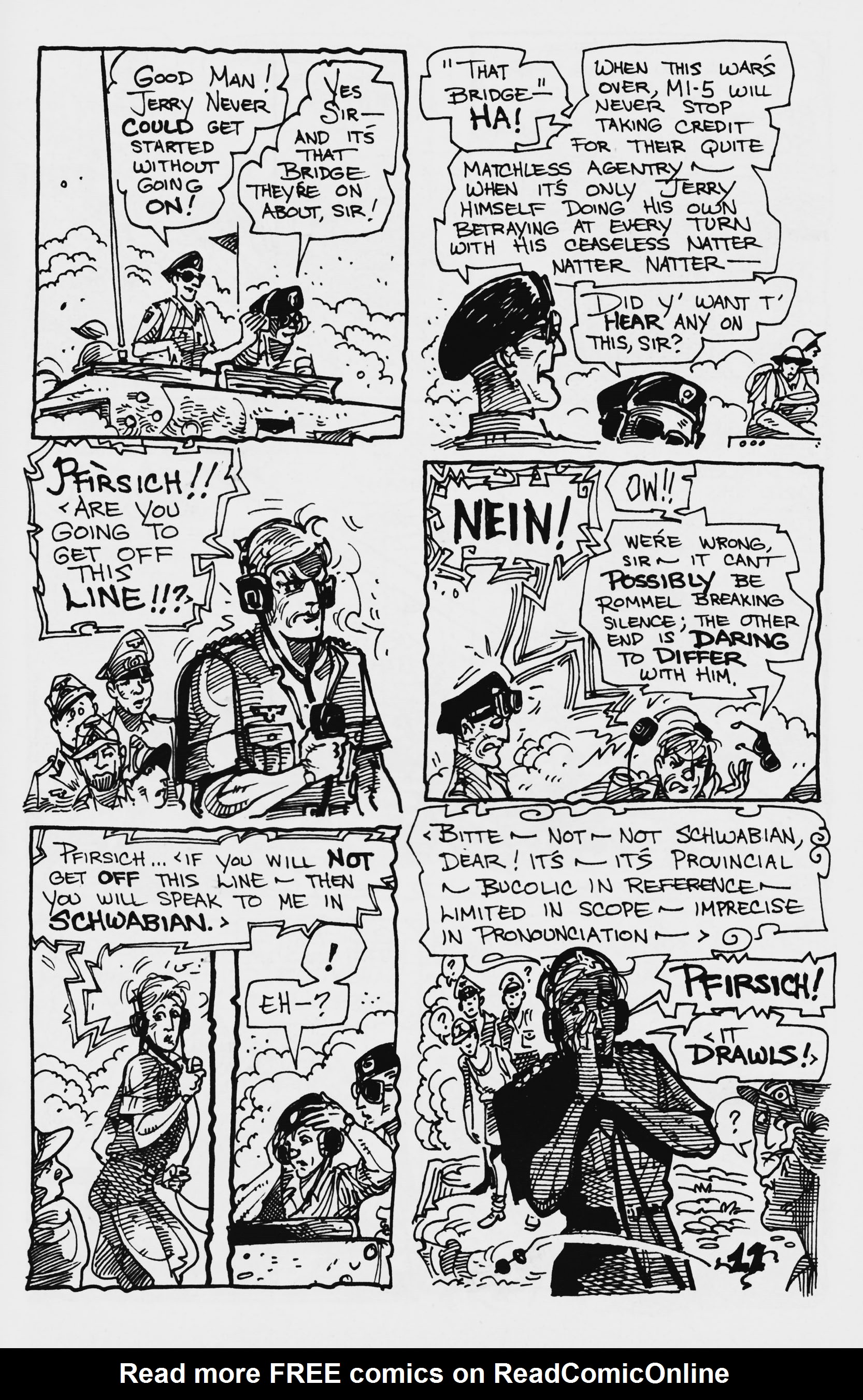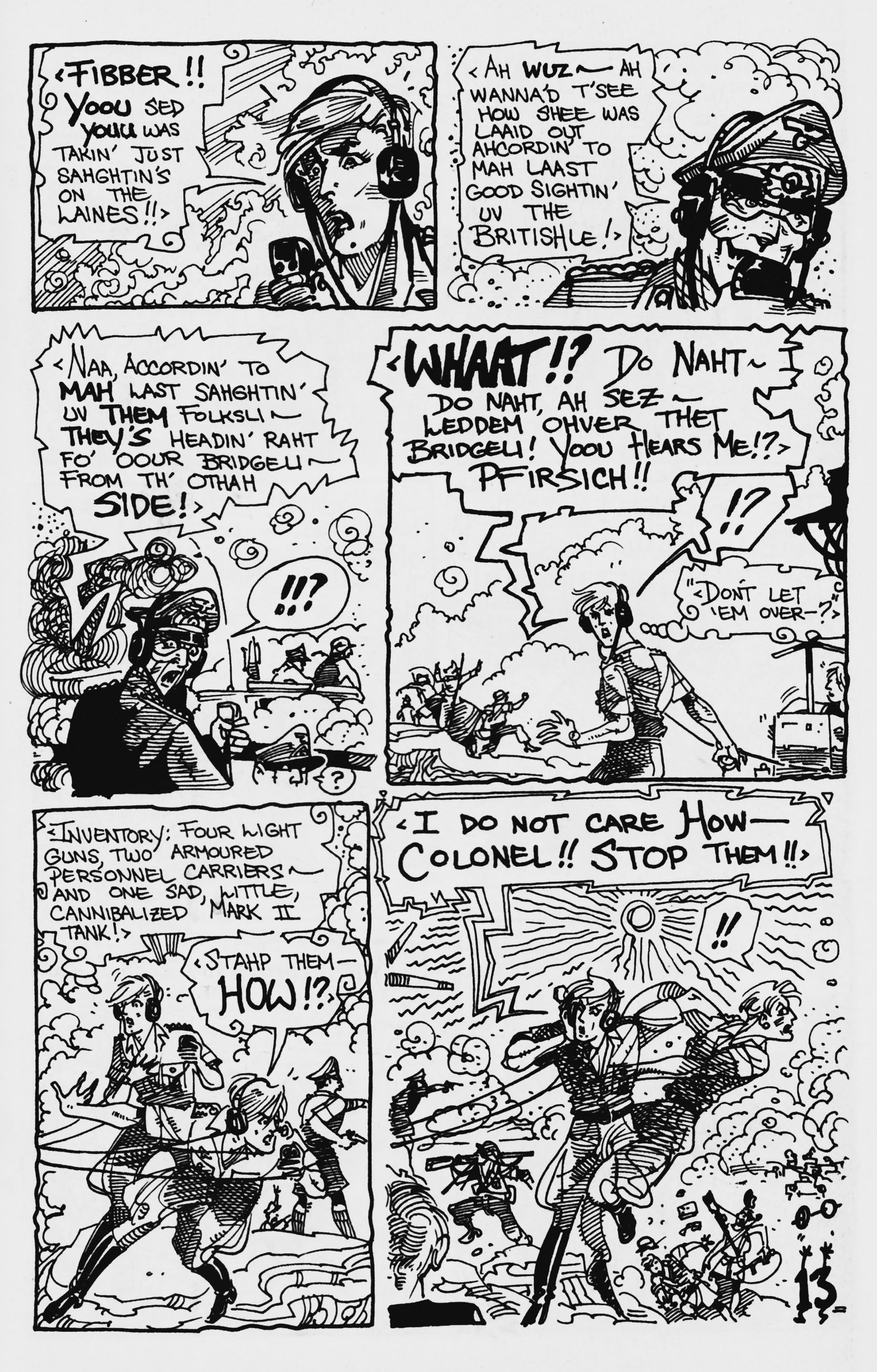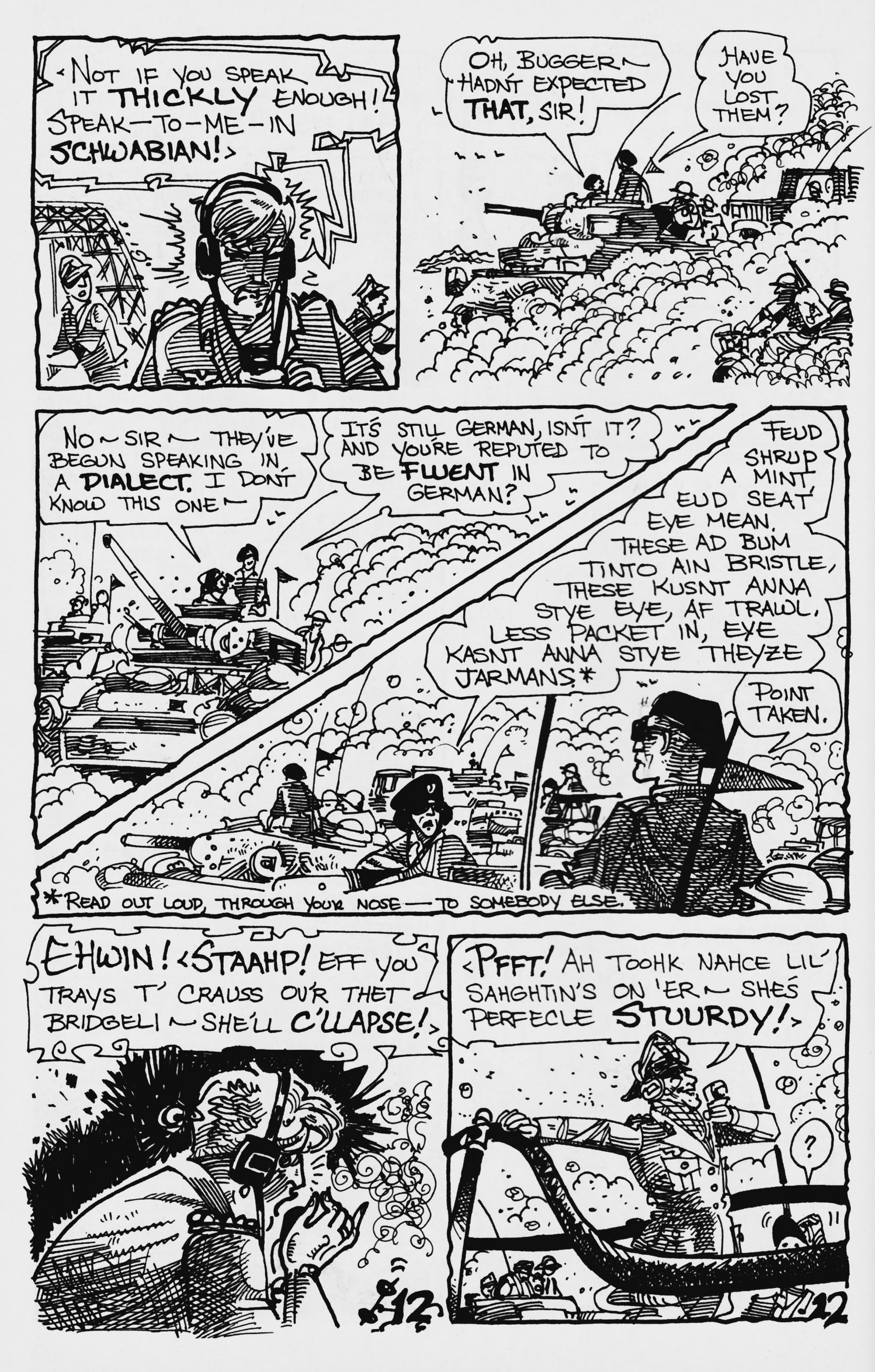 There’s a scene where Pfirsich and Erwin, realizing that the British are eavesdropping on their radio conversation, revert (to the refined Pfirsich’s disgust) to their native Swabian—which Barr chooses to render as quasi-hillbilly dialect: